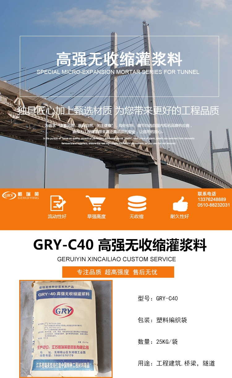 產品簡介:高強無收縮 灌漿料 主要性能指標 項目 GRY-C40 GRY-C50 GRY-C60 GRY-C70 GRY-C80 GRY-C90 抗壓強度(MPa) 2h / / / 20 / / 1d 20 25 30 40 / 55 28d 40 65 65 65 80 65 56d 60 65 65 65 80 90 90d 不降低 不降低 不降低 不降